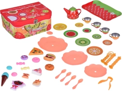 Dětská čajová souprava s ovocným motivem je vyrobena z odolného kovu (konvička, šálky, podšálky, tácek) a doplněna plastovou třípatrovou paterou a bohatou sadou sladkých i slaných dobrot. Vše je uloženo v atraktivním kufříku – ideální na úklid i přenášení.