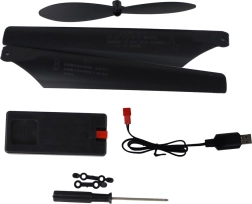- RC vrtulník, dálkový ovladač, USB nabíječka, náhradní vrtule, šroubovák, návod k použití, originální balení