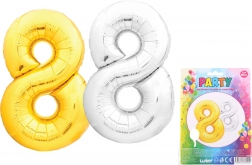 Stylový fóliový balónek ve tvaru čísla 8 o průměru 40 cm je ideální pro narozeniny, výročí i tematické oslavy. Dostupný v elegantních barvách zlatá a stříbrná, vyrobený z odolného nylonu pro delší výdrž a krásný lesk.