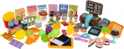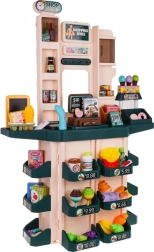 Součástí sady je tabule na kreslení, bohatá nabídka napodobenin potravin, a různé regály a police na uskladnění veškerého příslušenství. Tato hračka podporuje kreativitu a sociální hra mezi dětmi.
