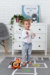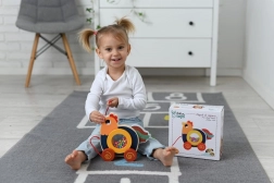 Tato barevná dřevěná hračka podporuje rozvoj motorických dovedností a koordinace rukou a nohou prostřednictvím tahání.