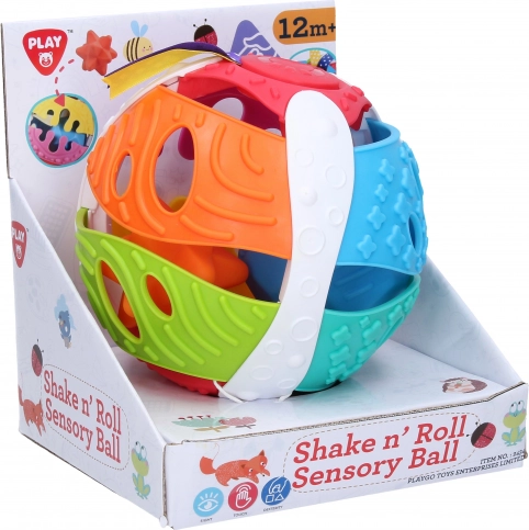 Zábavná vkládací koule Playgo o průměru 15 cm přináší dětem od 12 měsíců spoustu smyslové zábavy. Součástí jsou 2 měkké míčky, které se vkládají do koule, a stuha s otočným kolečkem, jež při otáčení vydává cvakající zvuk.