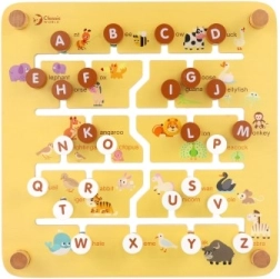 Chytrá a zábavná pomůcka pro předškoláky: oboustranná deska ukrývá dva světy. Na farmě děti posouvají kolíky se zvířátky, obličeji a ovocem po vyfrézovaných drahách na jejich místo. Otočením desky se změní na abecední labyrint – úkolem je dovést kolík s počátečním písmenem ke správnému zvířátku (názvy jsou v angličtině), takže se hravě procvičí písmena i slovní zásoba.