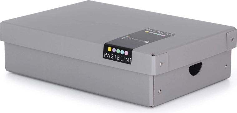 Praktická laminovaná úložná krabice PASTELINI v elegantní šedé barvě se stabilním víkem a výřezy na úchyty pro snadnou manipulaci. Díky kompaktním rozměrům 355 × 240 × 95 mm a nízké hmotnosti 0,41 kg spolehlivě uschová dokumenty, hračky i další drobnosti doma i v kanceláři.