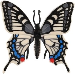 Tento dekorativní motýl inspirovaný druhem otakárek fenyklový (Papilio machaon) vyniká precizním zpracováním křídel s kontrastními vzory v černé, bílé a modré. Realistický vzhled podpoří přírodní atmosféru v dětském pokoji, pracovně i obývacím prostoru.