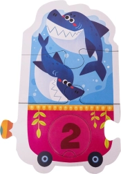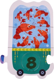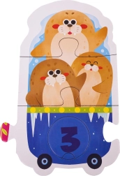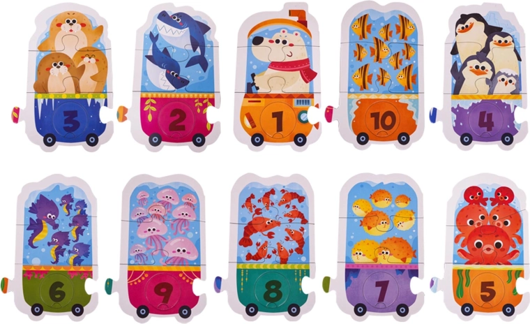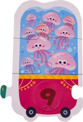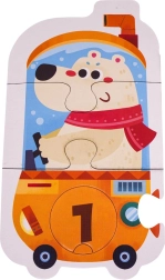 Postavte s dětmi dlouhý vláček z 10 vagónků a seznamte je s čísly a počítáním v rozsahu 1–10. Každý vagónek má přiřazenou číslici a obrázek se stejným počtem roztomilých zvířátek, takže si děti snadno propojí číslo s množstvím. Velké, pevné dílky z kartonu se dobře drží a díky hladkým, zaobleným hranám jsou bezpečné pro malé ručičky.