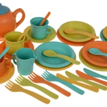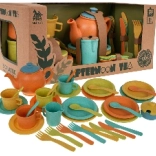 Sada obsahuje konvici s víčkem, čtyři šálky s podšálky, talíře hluboké i mělké, příbory, džbánek s hubičkou i hrnec s pokličkou. Díky rozmanitém příslušenství rozvíjí motorické dovednosti, kreativitu a sociální interakci.