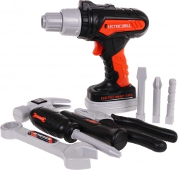 - Brašna, elektrická vrtačka, výměnné bity (plochý, křížový, vrták), nástavec na šroubovák, výměnné hroty, kladivo, klíč plochý–očkový, kleště, 2 menší a 2 větší prvky k šroubování, 3 destičky, 3 šrouby, 3 nástavce, 2 hmoždinky
