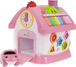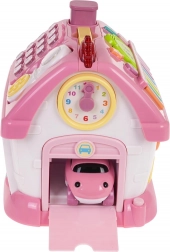Stříška skrývá vyjímatelný telefon, číselnou klávesnici a klavír s osmi barevnými klávesami, na které si děti mohou zahrát melodie, měnit tóny a rytmy. Přední část domku nabízí otevírací dveře se zvukem zvonku a světýlkem, boční stěny pak abecedu A–E s výslovností v angličtině a názvy tvarů, otočné prvky a garáž s výsuvným růžovým autíčkem.