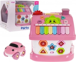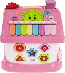 Barevný interaktivní domek pro děti od 18 měsíců podporuje učení hrou. Nabízí světelné a zvukové efekty, klavír s 8 klávesami, telefon, hodiny s pohyblivými ručičkami, třídění tvarů a písmen A–E, otevírací dveře a garáž a praktické madlo pro snadné přenášení. Součástí je také malé autíčko pro ještě více zábavy.