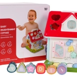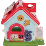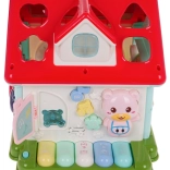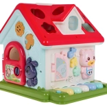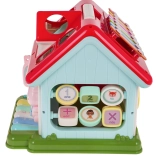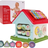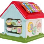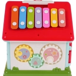 Střecha domku skrývá xylofon pro první muzicírování a sorter tvarů s 6 barevnými kostkami. Děti si procvičí jemnou motoriku, koordinaci oko–ruka i logické myšlení. Robustní zpracování z kvalitního plastu v živých barvách zaujme na první pohled a díky sklopnému madlu domeček snadno přenesete.