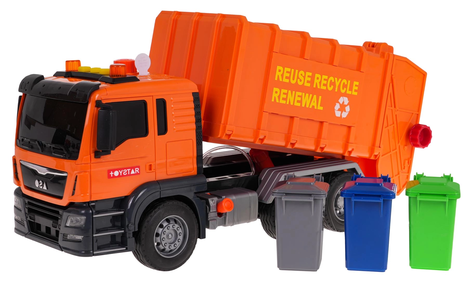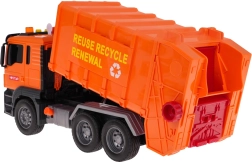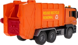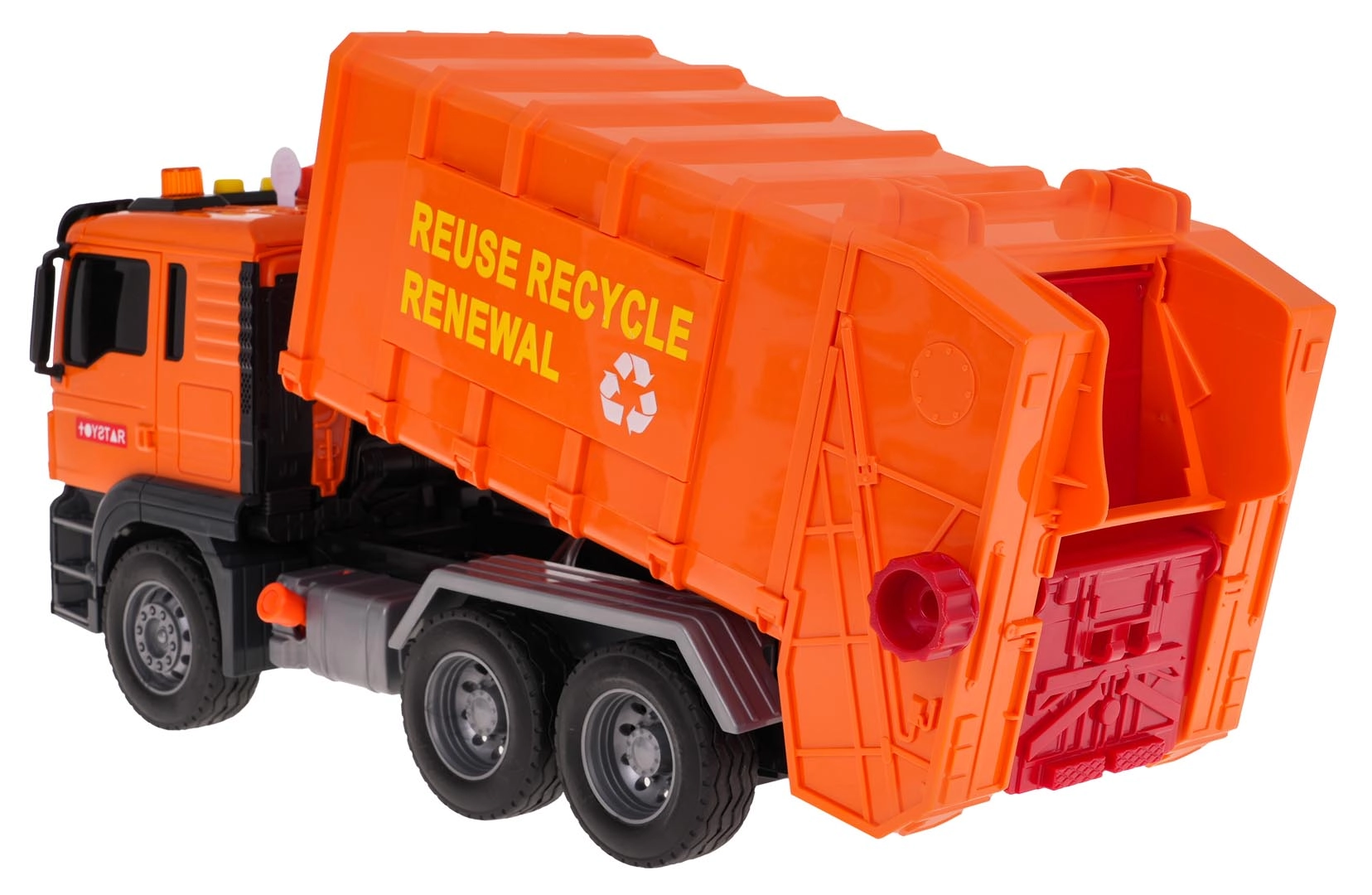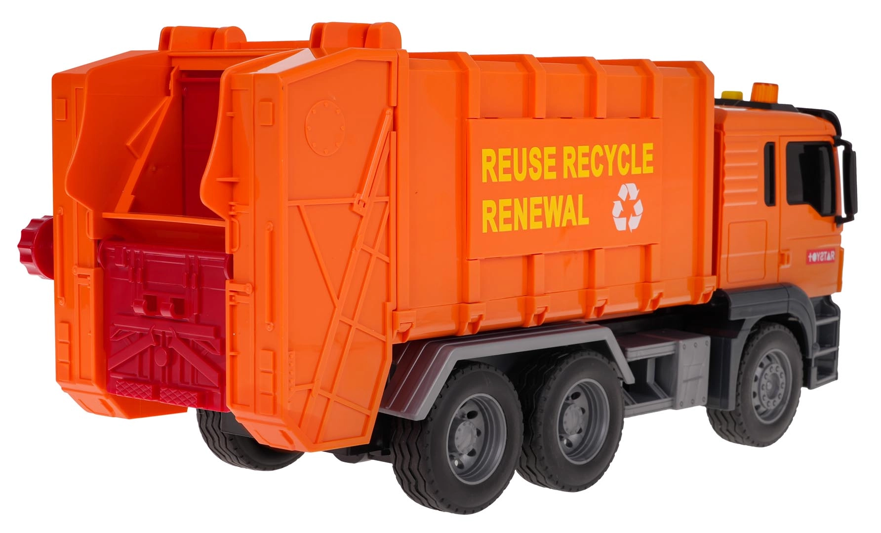 Objevte interaktivní popelářské auto s výrazným oranžovým designem a nápisy Reuse • Recycle • Renewal, které dětem hravou formou přibližuje třídění odpadu. Na střeše kabiny je panel tlačítek s efekty motoru, klaksonu a nakládky, které doprovází blikající světla. Zadní kontejner je výklopný a zadní klapka plně funkční.