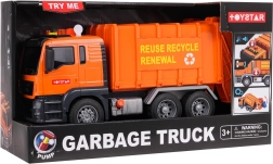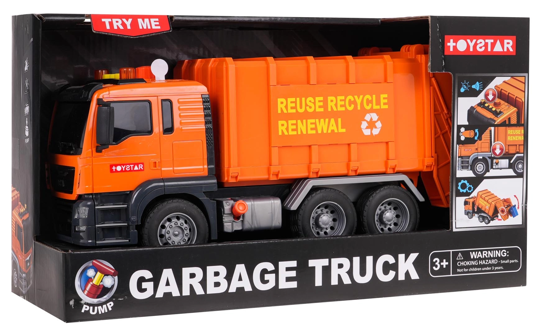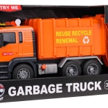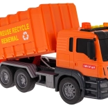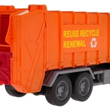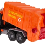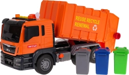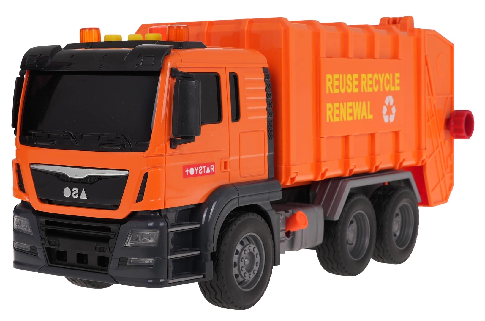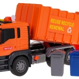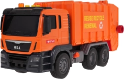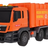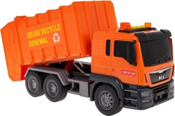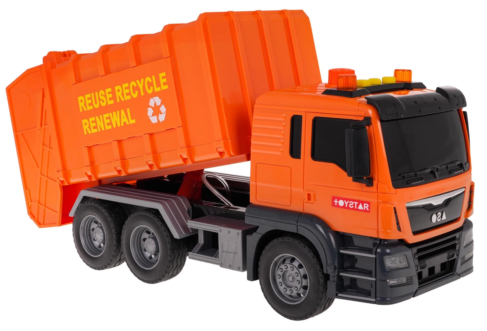 Objevte interaktivní popelářské auto s výrazným oranžovým designem a nápisy Reuse • Recycle • Renewal, které dětem hravou formou přibližuje třídění odpadu. Na střeše kabiny je panel tlačítek s efekty motoru, klaksonu a nakládky, které doprovází blikající světla. Zadní kontejner je výklopný a zadní klapka plně funkční.