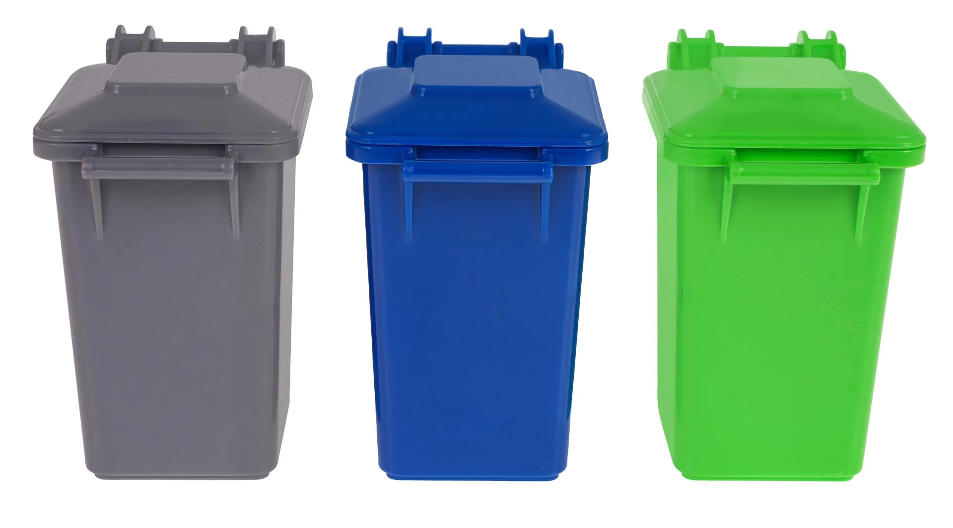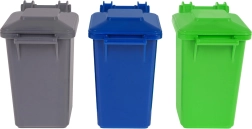 Součástí balení jsou tři barevné koše (šedý, modrý, zelený), které podporují porozumění recyklaci a ekologii.