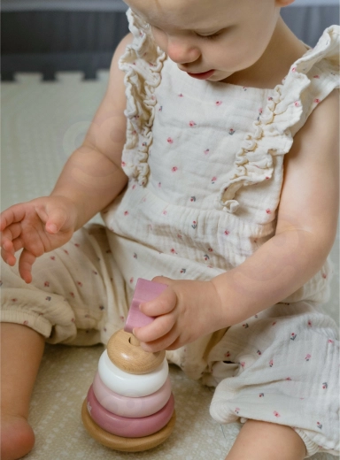 Navlékání kroužků na kolík přirozeně trénuje úchop, přesnost a koordinaci ruka–oko – ideální pro první motorické výzvy.