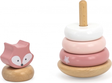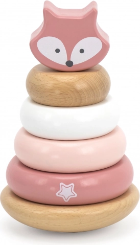 Tato dřevěná stohovací hračka nabízí 6 dílů v něžných pastelových barvách, včetně vrchního dílku s hlavičkou lišky. Děti navlékají kroužky na středový kolík podle velikosti, barvy či fantazie – procvičují tak logické myšlení, trpělivost a prostorové vnímání.