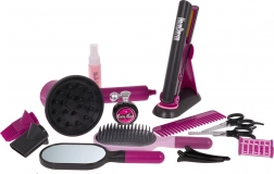 V balení nechybí praktické doplňky: nůžky i efilační nůžky, hřeben, kartáč, zrcátko, sponky, natáčky, rozprašovač a lahvička na „parfém“, ani stojan na sušič či žehličku. Sada je skvělá pro rozvoj jemné motoriky, kreativity a společné hraní.