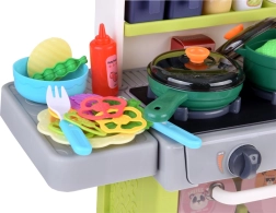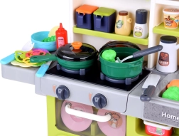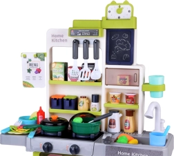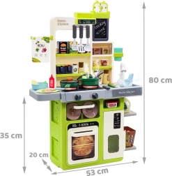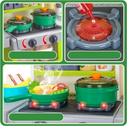 Tato interaktivní dětská kuchyňka přináší realistické vaření se světelnými hořáky, zvuky vaření, efektem páry a tekoucí vodou z kohoutku. Díky otevíracím skříňkám, troubě a “lednici” a bohaté výbavě v balení 63 dílů si děti užijí hodiny kreativní hry a rozvoje fantazie.