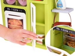 Otevřené úložné prostory, skříňky, trouba a poličky pomáhají dětem trénovat organizaci a udržovat pořádek v kuchyňských doplňcích. Nechybí tabulka na křídu pro vzkazy a menu, ani hodiny s pohyblivými ručičkami pro hravou výuku času.