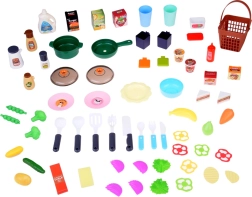 - Bohatá sada 63 dílů: hrnce, pánve, náčiní, talířky, kelímky, ovoce a zelenina, koření, nákupní košík a další.