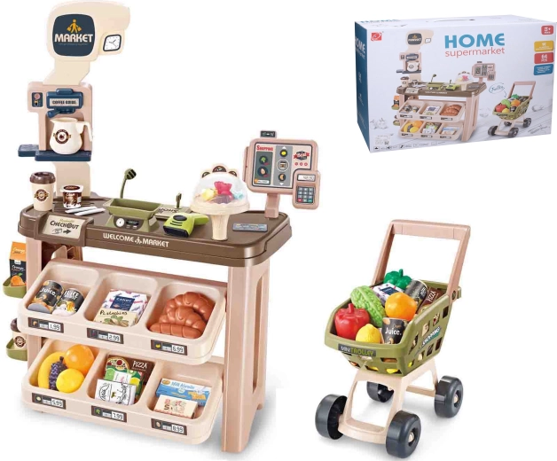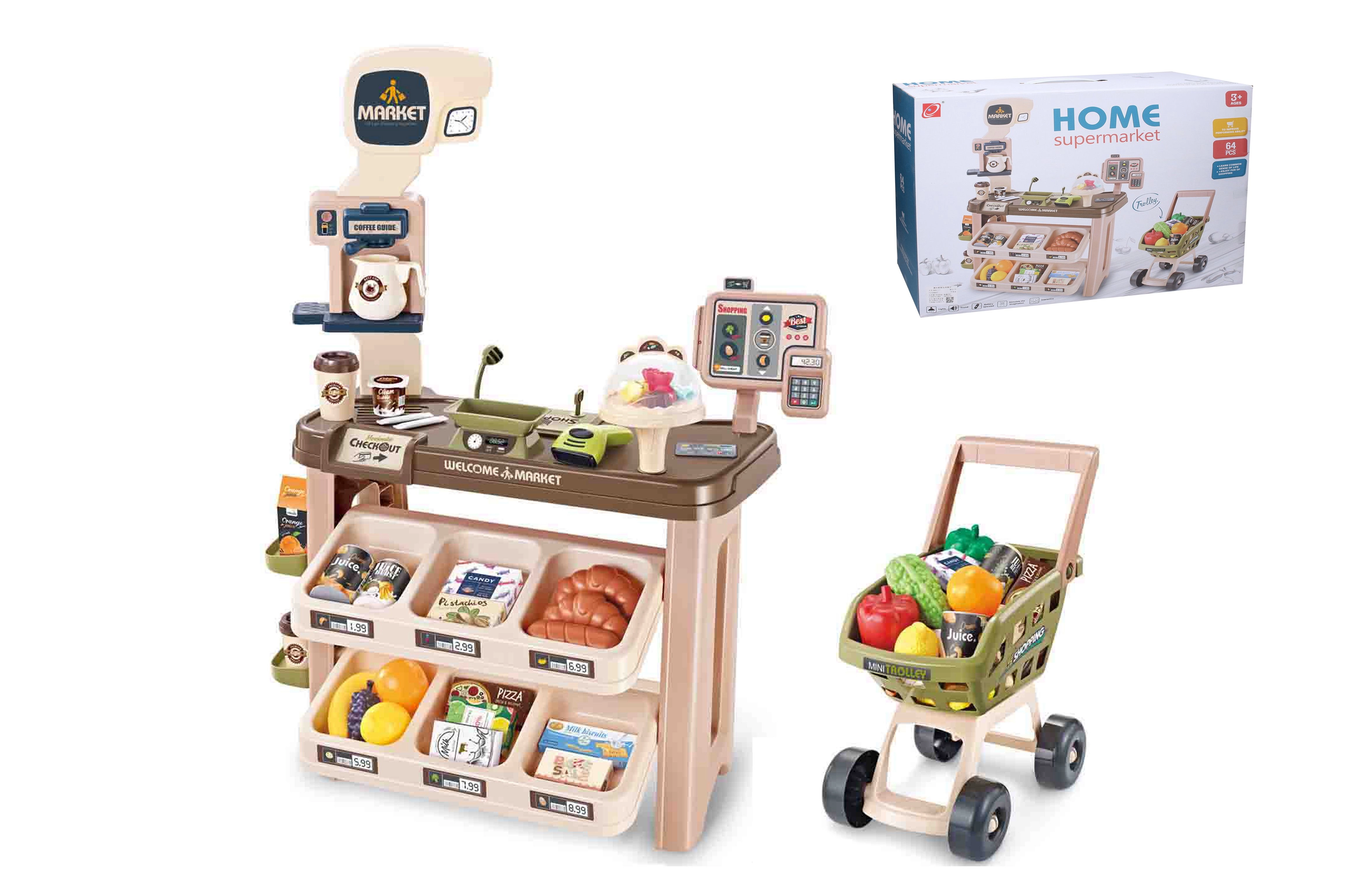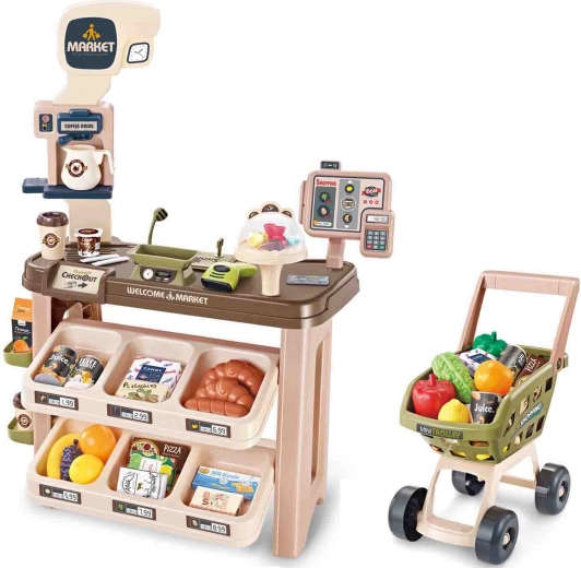 Součástí je bohaté příslušenství: pokladna, čtečka čárových kódů, platební terminál, platební karta, bankovky, mince a nákupní vozík, nechybí ani ovoce, zelenina, mléko, káva, džus, sušenky, pizza, oříšky a další potraviny pro realistickou hru. Elektronické prvky se snadno ovládají díky přepínači ON/OFF umístěnému na spodní straně platebního terminálu.