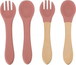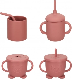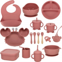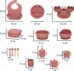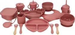 Kompletní sada silikonového nádobí pro děti v tmavě růžové barvě obsahuje talíře, misky, šálky a příbory. Nádobí je vyrobeno z bezpečného silikonu, snadno se čistí a je ideální pro učení samostatného stravování.