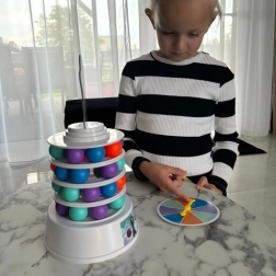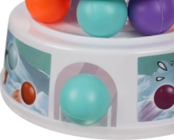 Co najdete v balení: pevná základna s výhozem kuliček a 2 samolepkami, 36 kuliček ve 4 barvách (světle modrá, modrá, oranžová, fialová), 3 kroužky pro stavbu věže, ruleta a 2 tyčinky na vytahování kuliček.