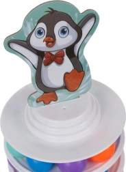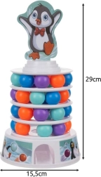 Postavte stabilní věž, nasázejte do každého patra 9 barevných kuliček, nasaďte obrubný kroužek a navrch umístěte kopuli s pingvinem. Hráči střídavě roztočí ruletu a podle padlé barvy pomocí patříků vytahují kuličky tak, aby se věž nezbořila. Kuličky propadnou dovnitř a vyjedou otvorem v podstavci – napětí roste s každým tahem!