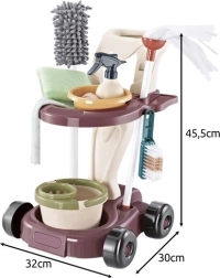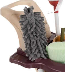 Čtyři široká kolečka, dvě prostorné police a praktické háčky a otvory pro uložení pomůcek. Děti snadno převážejí vědro, mop, stěrku i sprej a mají vše přehledně na jednom místě.