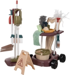 Chytré uspořádání umožňuje mít všechny pomůcky vždy po ruce: dole vědro s wringerem pro mop, nahoře miska, rozprašovač a stěrka na vodu. Speciální otvory a háčky drží mop, prachovku i utěrky, zatímco stabilní stojan přehledně pojme koště, smetáček a lopatky. Hra na úklid tak rozvíjí zodpovědnost, jemnou motoriku i smysl pro pořádek.