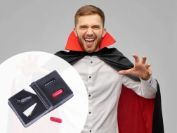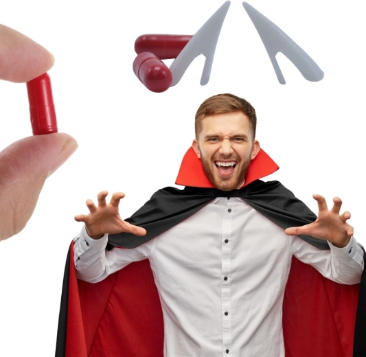 Součástí balení jsou kapsle s umělou krví pro dramatické a věrohodné efekty kolem úst či na kůži.