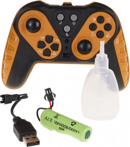 Bagr je napájen baterií typu 3,7 V 800 mAh (je součástí balení), zatímco dálkové ovládání vyžaduje 2 × AA baterie (nejsou součástí balení). Součástí balení jsou také nabíjecí kabel USB a plastová pipeta na vodu pro kouřové efekty.