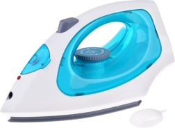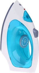 Žehlička je vyrobena s důrazem na detail v bílé a tyrkysové barvě, včetně nastavitelného teplotního knoflíku.