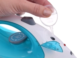 Žehlička má uzavíratelnou nádržku na vodu a k hračce je přiložena lahvička pro snadné plnění.