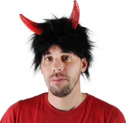 Stylová karnevalová paruka v motivu čerta pro dospívající a dospělé. Nabízí černé vlasy s krátkou ofinou a výrazné červené rohy, díky nimž snadno vytvoříte autentický čertovský kostým na maškarní bál, Mikuláše či tematickou párty.