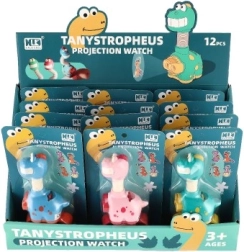 Zábavný náramkový projektor s motivem dinosaurů a vysouvací hlavou promítá obrázky pomocí 2 promítacích kotoučů. Baterie 3× AG13 jsou součástí, takže je připraven k okamžitému použití. K dispozici ve 3 barvách, vhodné od 3 let.
