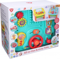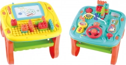 Oboustranný aktivní stoleček 37 cm kombinuje zábavu a učení v jednom. Horní strana s volantem, řadicí pákou a chrastítky rozvíjí jemnou motoriku a smyslové vnímání, zatímco spodní strana s magnetickou kreslicí tabulkou a podložkou pro kostky podporuje kreativitu a představivost.