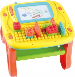 Zábavný oboustranný stoleček pro děti přináší dvě hrací plochy v jednom: na horní straně najdete volant, řadicí páku a chrastítka, na spodní pak magnetickou kreslicí tabulku a podložku pro stavění kostek. Součástí balení jsou kostky, melodie i baterie, takže je hned připraven k použití. Kompaktní velikost 37 cm se hodí do každého dětského pokoje.
