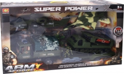 - Kompletní akční set: auto s přívěsem, raketomet, stíhačka, vrtulník, figurka vojáka a doplňky.