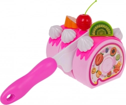 Tato bohatě vybavená růžová narozeninová sada promění pokoj v malou cukrárnu. Šestidílný dort spojený suchým zipem lze „krájet“ přiloženým nožem, zdobit ovocem, sušenkami a roztomilými doplňky. Velká svíčka se po stisknutí rozsvítí dvěma barvami (baterie RL41 jsou v balení), což dodá oslavě kouzelnou atmosféru.