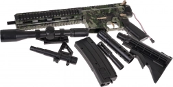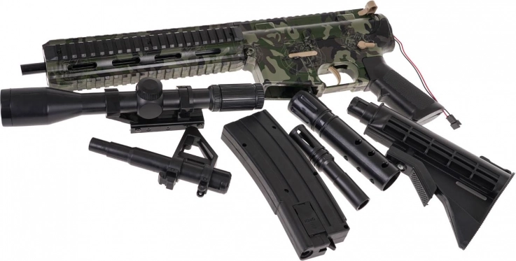 - karabin, zásobník, hlaveň, tlumič, zaměřovač, pažba, USB kabel, akumulátor 7,4 V, sáček s kuličkami k přípravě, popruh, ochranné brýle, návod (EN), dárkové balení