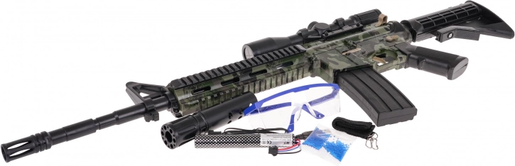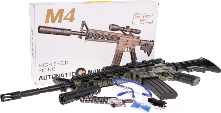 Objevte akční zábavu s realisticky zpracovaným karabinem M4 na gelové kuličky pro teenagery od 14 let. Zbraň nabízí manuální i automatický režim střelby, optiku se zoomem a bohaté příslušenství včetně tlumiče, zásobníku a ochranných brýlí. Gelové kuličky po zásahu prasknou a jsou bezpečné, napájení zajišťuje nabíjecí akumulátor 7,4 V s USB dobíjením.