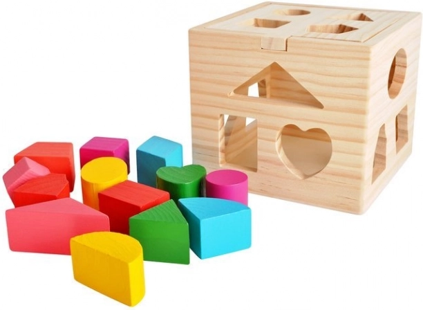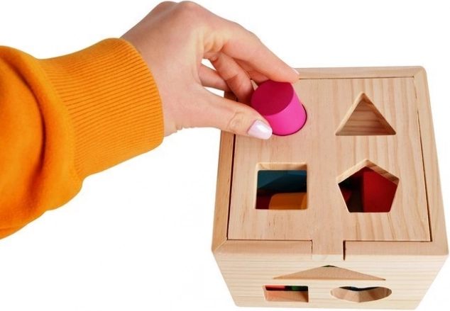 Tato dřevěná vkládačka je ideální vzdělávací hračka pro děti od 2 let. Kostka má vyřezané otvory různých tvarů a obsahuje 13 pestrobarevných bloků, které do nich přesně pasují. Děti trénují trpělivost, soustředění a rozvíjejí kognitivní dovednosti při hledání správných kombinací.