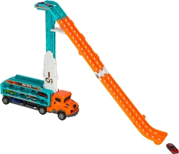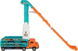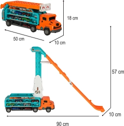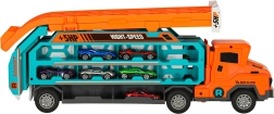 Multifunkční kamion na první pohled slouží jako praktický nosič – pojme až 6 malých autíček a umožní jejich snadné převážení. Během chvilky se však promění v působivý závodní set se dvěma paralelními drahami pro akční souboje a fair play zábavu sourozenců.