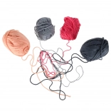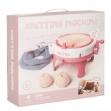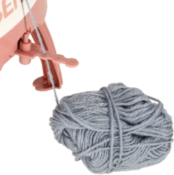 Součástí sady jsou 4 barevná klubka příze (tmavě šedá, světle šedá, růžová, béžová), jehly různých velikostí a háček pro snadné dokončení a sešívání. Stabilní nožičky a přísavky pomáhají udržet stroj pevně na místě během práce.