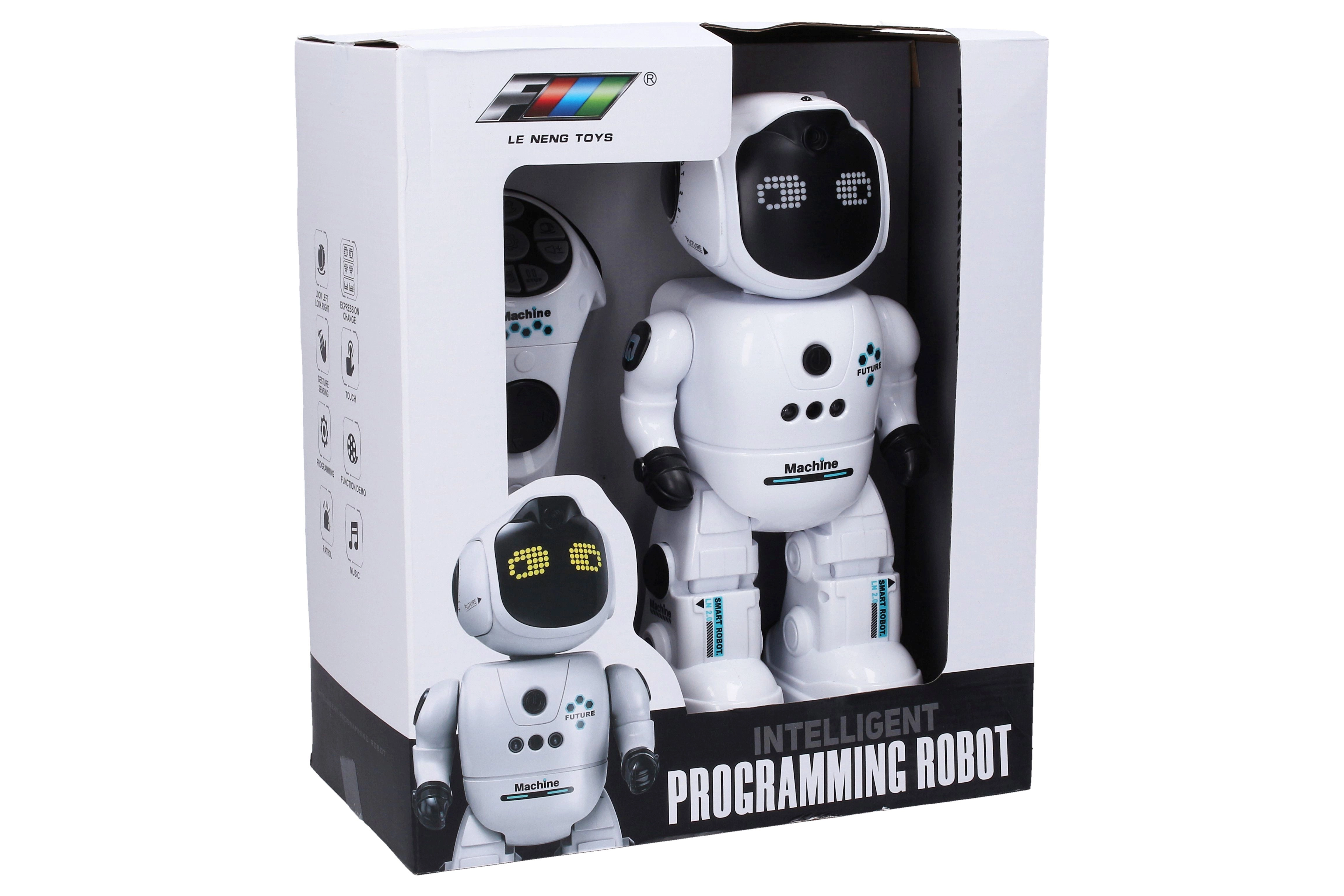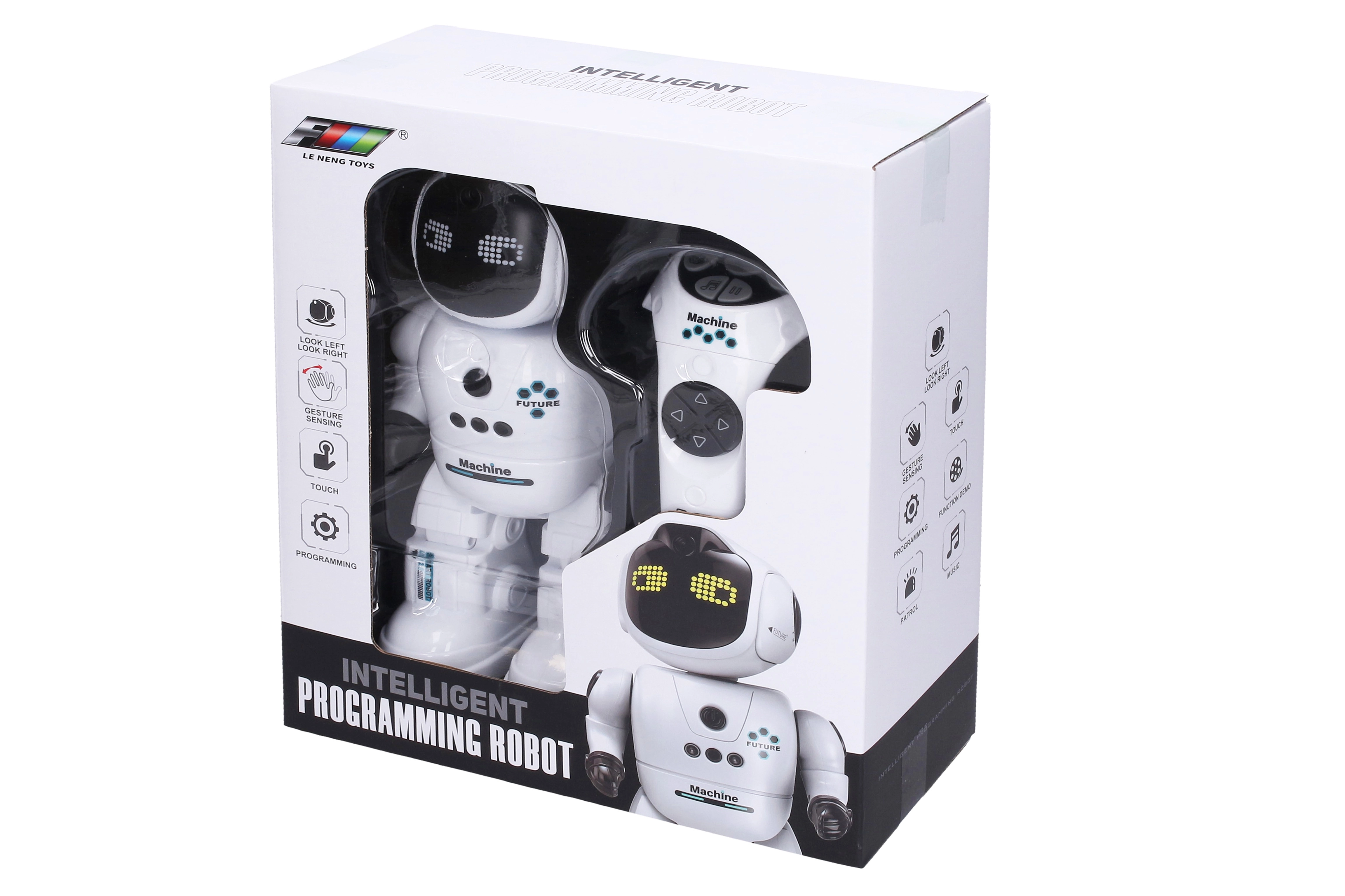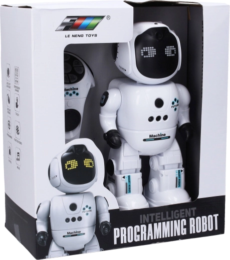 Robot nabízí režim programování, demo ukázky, zvuky a hudbu s nastavením hlasitosti. Ovládání je intuitivní – stačí gesto, dotyk nebo stisk tlačítek. Tlačítko ON/OFF najdete pohodlně na jeho hrudi. Nabíjení probíhá přes USB kabel (součástí balení), do ovladače stačí vložit 2× AAA baterie (nejsou součástí).