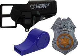 Součástí je pouzdro, odznak a píšťalka – vše, co malý policista potřebuje k hlídání pořádku a akčním scénkám.
