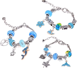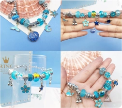 Stříbrno‑modré korálky, přívěsky a řetízky s motivy moře, květin a srdíček – nekonečné možnosti kombinací.