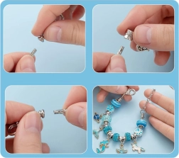 Tato kreativní sada nabízí bohatý výběr komponentů pro snadné navlékání a skládání vlastních doplňků. Kovové náramky, nastavitelné řetízky a voskové šňůrky doplněné o dekorativní korálky a přívěsky charms umožní vytvořit šperky přesně podle vaší fantazie – od mořských motivů až po srdíčka či květiny.