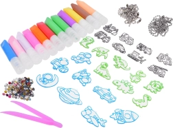 Tato rozšířená sada přináší dětem zábavný vstup do světa tvoření. Speciální barvy se snadno nanášejí do vyhloubených linií šablon, nepřetékají přes okraje a pomáhají vytvořit precizní a působivé přívěsky. Hotové motivy stačí ozdobit dekoračními kamínky a zavěsit na kovové kuličkové řetízky – ideální na klíče, batoh nebo jako dekoraci do pokoje.